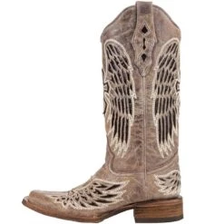 Give your outfit some flare with these Corral Brown With Black Wings & Cross Cowgirl Boots. These handcrafted boot are constructed of distressed brown leather with black inlay cross and wing designs. These boots feature leather lining and lightly cushioned insoles to provide much needed comfort for long wear. Completes most outfits in any season, these are a cowgirl’s must haves!