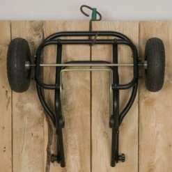 You can’t even think of all the uses you’ll find for this little workhorse! It’s designed to hold a standard 70-Quart Muck Tub (not included), but handily doubles as a pneumatic two-wheeler for moving feed sacks, square bales, garbage cans, or any you-name-it cargo up to 350 pounds. The drop-down retaining ring securely holds a Muck Tub or other containers in place, and easily collapses for loading full, heavy, or large items. Large pneumatic tires allow the cart to maneuver over almost any terrain, indoors or outdoors. The retractable kickstand holds the cart in place for stable loading and unloading. Adjustable handle locks securely at two heights. It easily folds for storage or for carrying along in a trailer or vehicle. A lifesaver for farm and ranch.